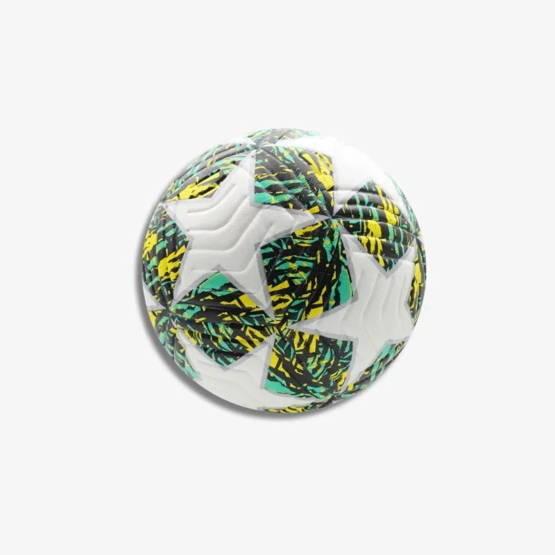Le ballon "Éclair Nova" se distingue par son design éclatant et énergique. Orné de motifs en éclats de vert fluo, jaune vif et noir sur un fond blanc parsemé d'étoiles, il évoque la puissance et la rapidité d'un éclair. Idéal pour les joueurs qui aiment se démarquer sur le terrain, ce ballon allie style et performance pour offrir des sensations de jeu uniques.