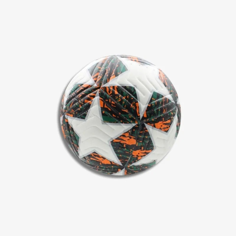 Le mélange des couleurs orange, vert foncé et noir, entrecoupé par des étoiles blanches en relief, symbolise la force d'une tempête prête à exploser sur le terrain. Le motif tourbillonnant donne une impression de mouvement permanent, rendant le ballon "Tornade Éclipse" parfait pour des matchs spectaculaires. Cette esthétique unique reflète l’esprit combatif et le désir de victoire des joueurs.